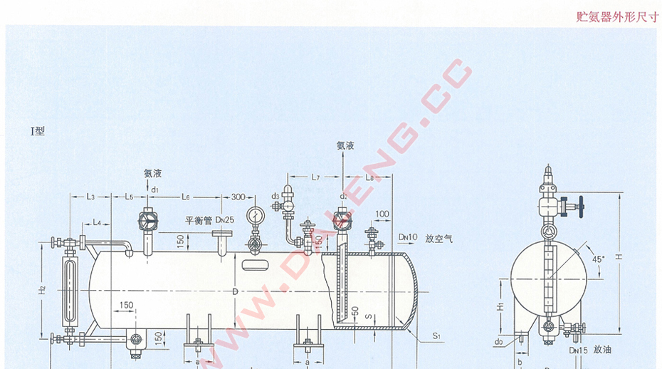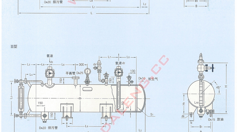 卧式筒形容器,圆筒形的壳体两端为椭圆形封头所封闭,构成本设备的贮存容积。容器的一端设有液位指示器,圆筒的一端顶部有进液接管、另一端设有一伸到距底50mm 的出液管,出液管口在容器的上方。容器底部有一排污管(兼集油器作用) ,其上设有一放油阀。容器上还装有平衡接管、放空气阀、压力表和安全阀。